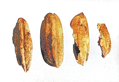 櫟果。殼斗科櫟屬植物的種子,俗稱橡子富含淀粉,其含量?jī)H次于五谷而遠(yuǎn)高于豆類,其成熟季節(jié)相對(duì)集中,從一棵樹上就可以收獲較多,自古以來(lái)作為民間食物被廣泛食用。現(xiàn)在,舞陽(yáng)縣附近的二郎山和嵖岈山依然有很多橡樹,周邊不少小商戶專營(yíng)橡子涼粉,味道鮮美。賈湖發(fā)掘時(shí)出土100多粒炭化櫟的果核,均為先民從遺址周圍采摘作食物用,大多保存完整。
