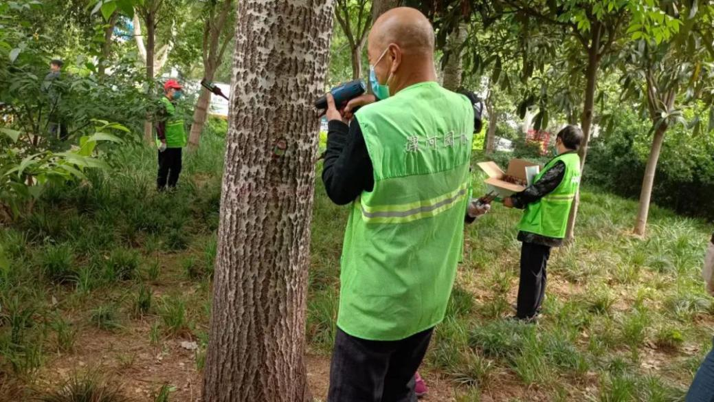 5月25日上午,漯河市區(qū)道路兩側(cè)、游園綠地內(nèi)一群身穿綠色馬甲的工人正在給樹木“打針”。這是怎么回事?據(jù)市城管局園林綠化養(yǎng)護(hù)中心工作人員介紹,他們是在給楊樹柳樹雌株注射赤霉酸。經(jīng)過近兩個(gè)月的綜合防治,毛白楊和柳樹飄絮基本結(jié)束,本地楊飄絮也接近尾聲,市園林中心防治人員剛剛卸下“戰(zhàn)斗員”的身份,又紛紛化身接種“預(yù)防針”的“醫(yī)生”。