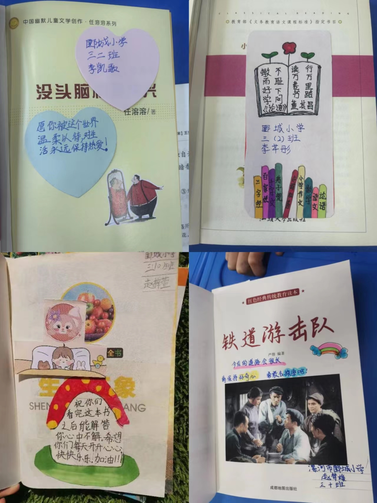 活動現(xiàn)場,同學(xué)們不但拿出自己的圖書交流,還把愛心和對留守兒童的祝福紛紛寫在書上。“愿你被這個世界溫柔以待,永遠熱愛,永遠朝氣蓬勃!”“我希望你看到這本書時嘴角是上揚的,愿你暢游書海,探尋知識的奧秘!”“國家繁盛的責(zé)任就在我們的肩上,親愛的朋友,讓我們用愛心和勇氣為我們的祖國添彩,為這份責(zé)任而努力。”