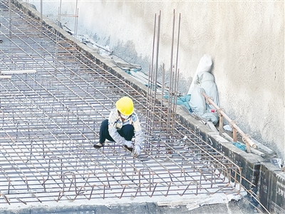 記者在好運府建筑工地看到,塔吊、挖掘機、渣土車來回穿梭,建筑工人正聚精會神地進行鋼筋連接作業(yè)。上午9點30分,他們的衣服已被汗水浸濕。