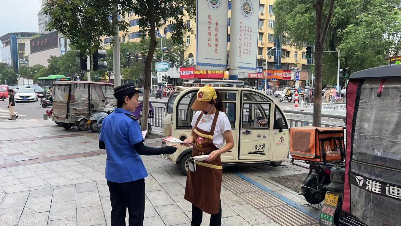 二、執(zhí)法服務(wù),兼顧并重。在認(rèn)真宣傳講解文明條例的同時,中心人員積極宣傳《漯河市城市市容和環(huán)境衛(wèi)生管理條例》,提升知曉率。在日常工作中,始終堅持“721”工作法,通過“服務(wù)為先”解決70%的問題,通過“管理優(yōu)化”解決20%的問題,通過“執(zhí)法規(guī)范”解決10%的問題,變被動管理為主動服務(wù)、變末端執(zhí)法為源頭治理,對非機(jī)動車亂停亂放現(xiàn)象,采取鎖、拖、教、罰方式;對店外經(jīng)營、占道經(jīng)營等問題,以教育、勸導(dǎo)為主,對拒不配合或?qū)覄駥曳刚?,堅持融合?zhí)法,依托手持終端進(jìn)行現(xiàn)場處罰。
