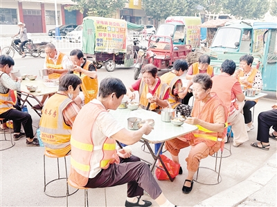環(huán)衛(wèi)工人在愛心粥屋吃早餐。