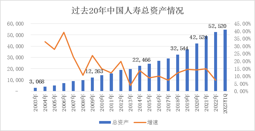 保費(fèi)規(guī)模的增長(zhǎng),也帶動(dòng)著公司的資產(chǎn)規(guī)模迅速增長(zhǎng)。經(jīng)過20年的積累,國(guó)壽壽險(xiǎn)2022年的總資產(chǎn)規(guī)模達(dá)到了5.25萬億元,成為我國(guó)首家資產(chǎn)規(guī)模突破5萬億的壽險(xiǎn)公司,較2003年上市之初的3287億元增長(zhǎng)了15倍。