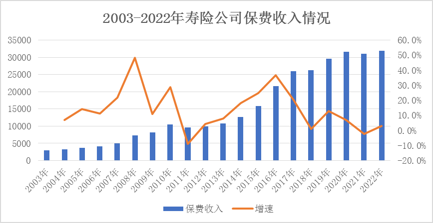 剛剛過去的2022年,我國(guó)人身險(xiǎn)公司保費(fèi)收入達(dá)到了3.2萬億,而在2003年,人身險(xiǎn)公司整體保費(fèi)還不足3000億,過去20年,我國(guó)人身險(xiǎn)公司保費(fèi)規(guī)模增長(zhǎng)了10倍,復(fù)合增長(zhǎng)率超過了13%。在此期間,我國(guó)的GDP也從2003年的13.74萬億增長(zhǎng)到2022年末的121.02萬億,復(fù)合增長(zhǎng)率也超過了12%??梢钥闯?,過去20年,人身險(xiǎn)公司的保費(fèi)增長(zhǎng)和GDP的增長(zhǎng)基本吻合,這也符合人身險(xiǎn)業(yè)務(wù)的發(fā)展規(guī)律。隨著國(guó)家經(jīng)濟(jì)實(shí)力的增強(qiáng),國(guó)民收入的提高,人們對(duì)保險(xiǎn)的需求進(jìn)入到了一個(gè)新的增長(zhǎng)階段,也為國(guó)內(nèi)的人身險(xiǎn)公司送來了發(fā)展的東風(fēng)。