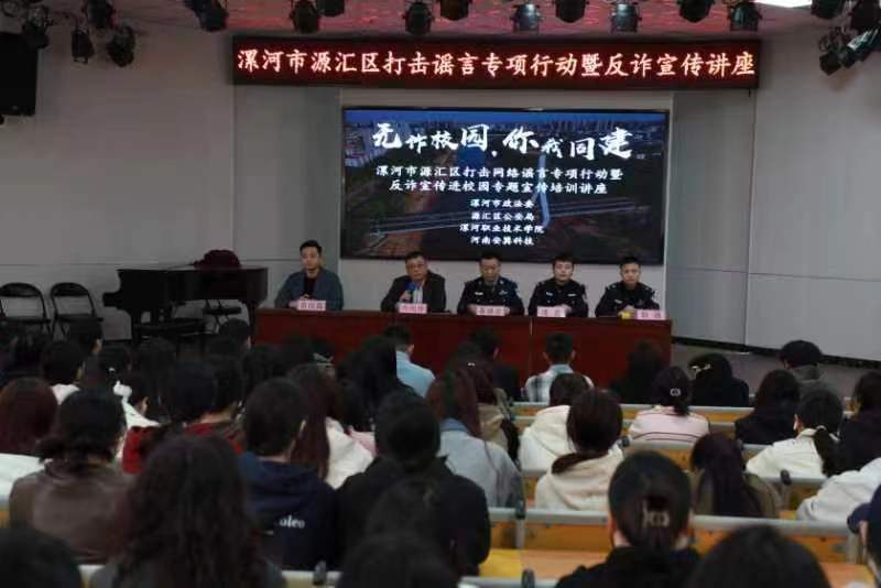 (通訊員:趙予曉)為深入推進(jìn)打擊整治網(wǎng)絡(luò)謠言專(zhuān)項(xiàng)行動(dòng),有效提升廣大群眾對(duì)網(wǎng)上虛假信息的鑒別、識(shí)別能力和增強(qiáng)我轄區(qū)師生安全防范意識(shí),筑牢網(wǎng)絡(luò)安全防線(xiàn),提高反詐騙應(yīng)對(duì)能力。3月14日下午,漯河市公安局源匯分局聯(lián)合漯河市職業(yè)技術(shù)學(xué)院開(kāi)展打擊網(wǎng)絡(luò)謠言專(zhuān)項(xiàng)行動(dòng)暨反詐宣傳進(jìn)校園專(zhuān)題宣傳培訓(xùn)講座。學(xué)校師生300余人參加本次講座。