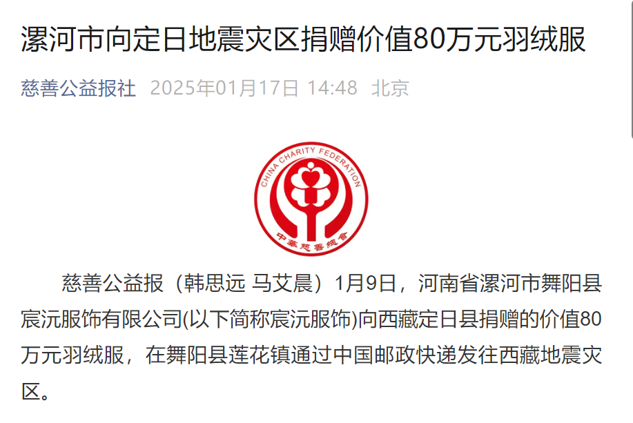 1月9日,河南宸沅服飾有限公司總經(jīng)理李書鋒聯(lián)系市縣慈善總會,捐贈價(jià)值80萬元的羽絨服,通過中國郵政快遞專車發(fā)往西藏災(zāi)區(qū)。