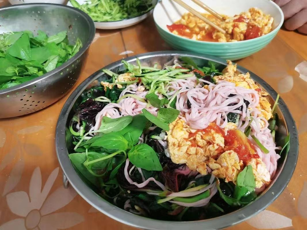 蒜香是源匯夏日的靈魂印記。紫皮蒜瓣剝落時(shí)迸濺汁液,辣意鉆入指甲縫,這是味覺蘇醒的前奏。粗陶蒜臼穩(wěn)踞灶臺(tái),石錘起落間,蒜粒與青鹽漸成乳白脂膏。此時(shí),十香菜翩然而至——這種被《神農(nóng)本草經(jīng)》記載的香草,在漯河人陽臺(tái)的泡沫箱里蓬勃生長(zhǎng),葉片揉碎時(shí)散發(fā)薄荷與檸檬交織的清氣。