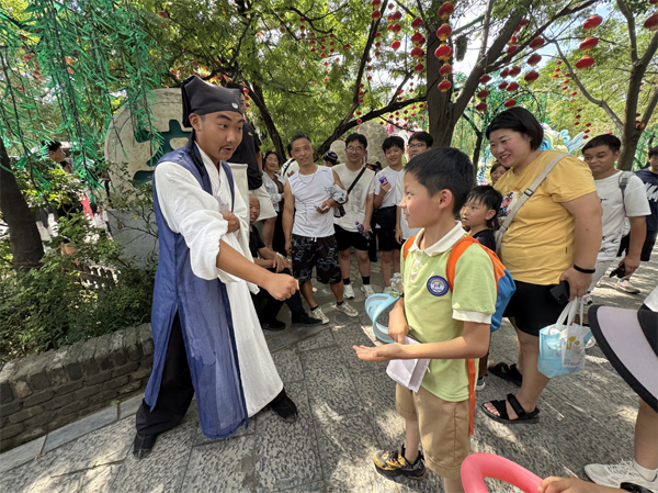 一踏入萬歲山武俠城,古色古香的宋代街巷和建筑便映入孩子們眼簾,仿佛穿越回了千年前的大宋。街道上,鄭記肉鋪、獅子樓、王婆茶莊等實景店鋪,充滿生活氣息,孩子們好奇地打量著,想象著古人的生活場景。街邊藝人的精彩表演引得孩子們陣陣驚嘆,歡呼聲此起彼伏。《三打祝家莊》里,逼真的城墻、城門、大炮和烽火臺,激烈的戰(zhàn)斗場面配合影視爆破、云梯炮戰(zhàn)、大型馬術等實景拍攝技術,將《水滸傳》中的情節(jié)鮮活呈現,孩子們看得目不轉睛,被綠林好漢們的江湖豪情深深吸引,演出結束后,掌聲雷動。在萬歲山武俠城內,孩子們還觀賞了多場精彩絕倫的演出。從《吊環(huán)》的驚險特技到《大宋奇兵》的英勇無畏,再到《李逵斷案》和《林沖戰(zhàn)楊志》……此外,孩子們還進行了一系列互動體驗活動。通過石頭剪刀布、投壺等游戲來賺取銀票,換取自己喜歡的物品。每一場演出都讓孩子們陶醉其中,流連忘返。