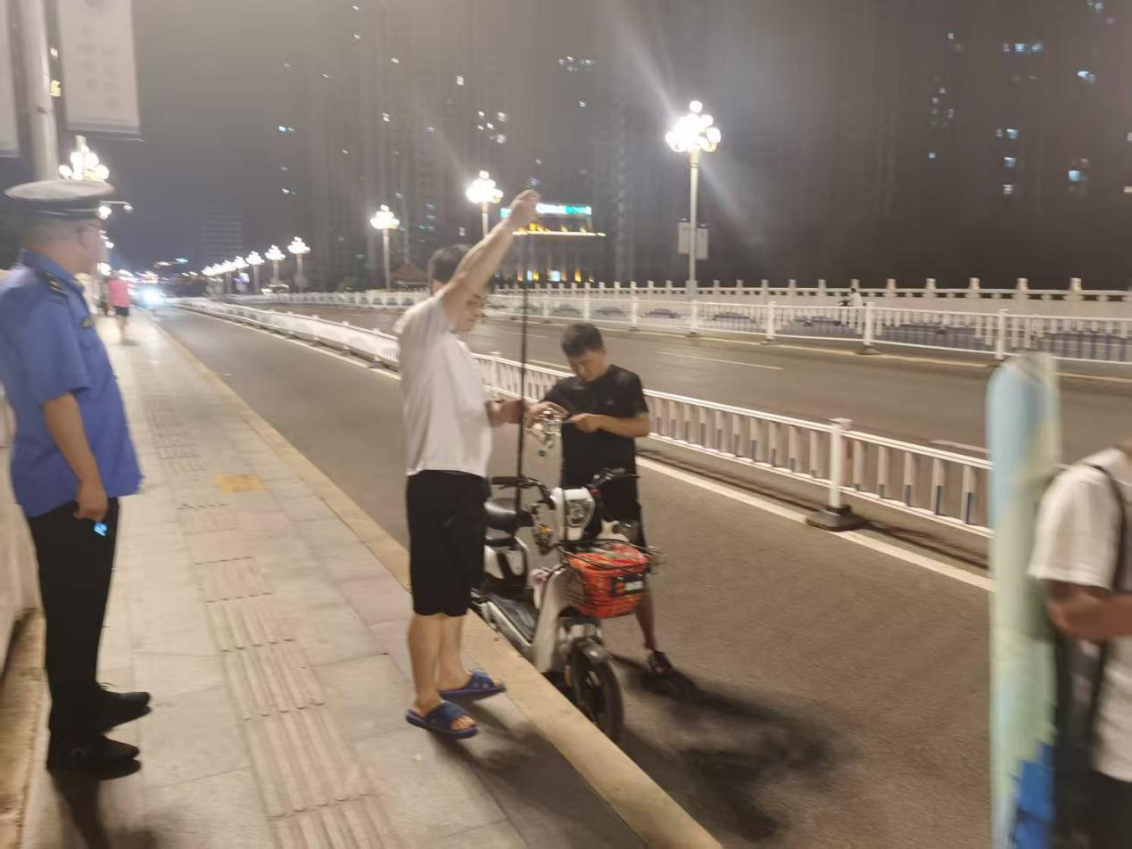 “晚上橋面光線不好,來回過往的行人和非機動車輛也多,您在這兒垂釣實在是不安全啊,趕快收竿回家吧。”8月3日20時許,在漯河市金山路沙河橋上,經(jīng)開區(qū)城市管理綜合行政執(zhí)法大隊大隊長曹陽帶領(lǐng)夜間執(zhí)法人員在轄區(qū)范圍內(nèi)開展橋面垂釣治理行動。