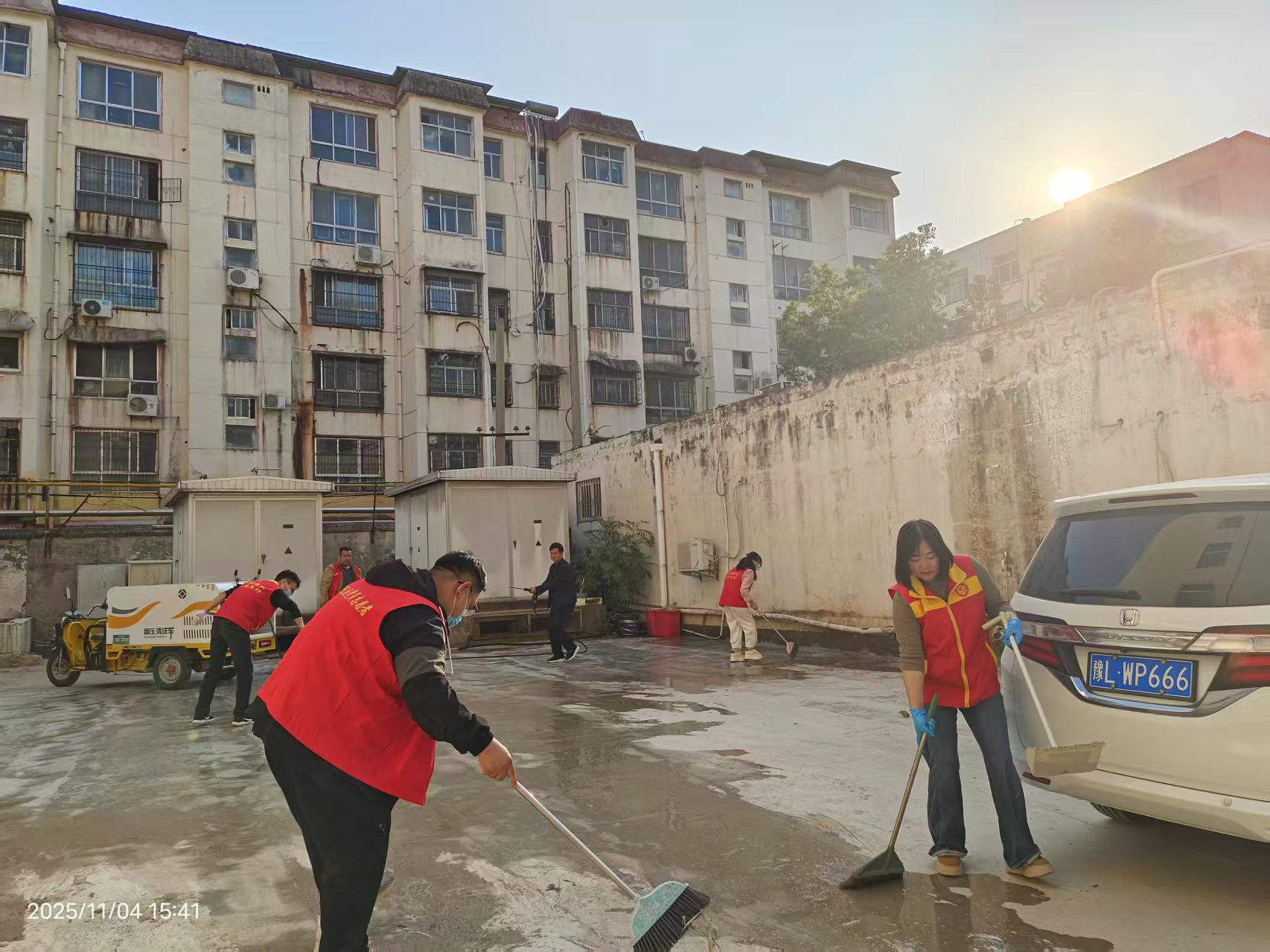 公共區(qū)域的“煥顏洗禮”:高壓水槍發(fā)出有力的轟鳴,水流所到之處,地面沉積的污漬、苔蘚被一掃而光。志愿者們揮舞著掃帚,配合水槍沖洗,將淤泥和積水推向下水道。沖洗過(guò)的地面露出了原有的顏色,在陽(yáng)光下泛著濕潤(rùn)的光澤,仿佛為小區(qū)進(jìn)行了一次徹底的“潔面”。