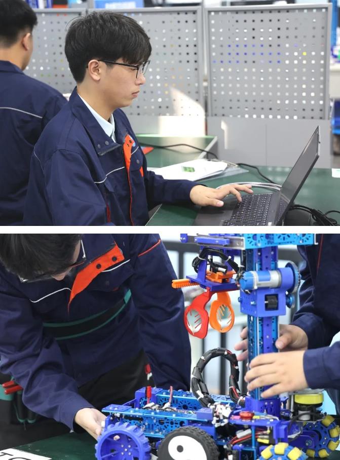 作為備戰(zhàn)第三屆全國技能大賽自主移動(dòng)機(jī)器人(世賽選拔項(xiàng)目)的選手,楊奇瑞深知,全國技能大賽的賽場沒有僥幸。自主移動(dòng)機(jī)器人項(xiàng)目技術(shù)復(fù)雜、精度要求高,涉及機(jī)械裝配、電路搭建、傳感器調(diào)試、路徑規(guī)劃與智能控制等多個(gè)模塊,容錯(cuò)率極低。一個(gè)微小的代碼錯(cuò)誤或機(jī)械偏差,就可能導(dǎo)致整套系統(tǒng)失效。省賽奪冠后,全國賽的對手更強(qiáng)、標(biāo)準(zhǔn)更高、任務(wù)更難。楊奇瑞沒有松懈,反而更加拼命。為了攻克難關(guān),他和搭檔介明鑫反復(fù)演練上百種場景,記錄上千組數(shù)據(jù),常常為解決一個(gè)問題通宵達(dá)旦。困了,就在實(shí)訓(xùn)室椅子上瞇一會(huì)兒;餓了,泡一碗面繼續(xù)干。