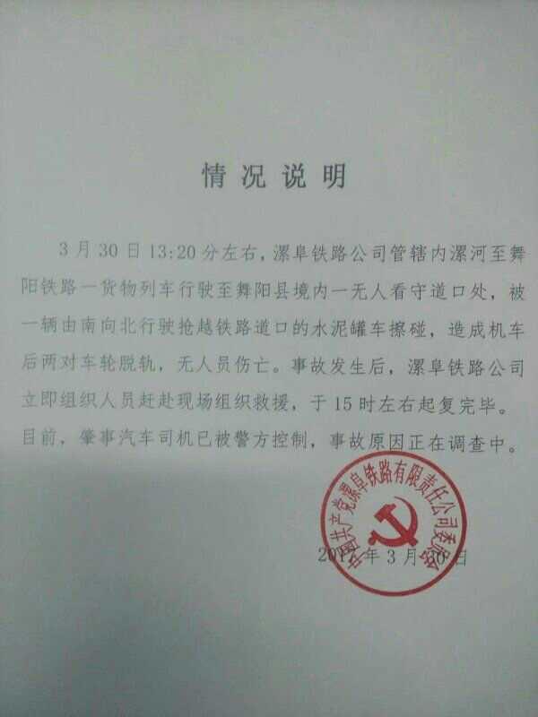 3月30日13:20分左右,漯阜鐵路公司管轄內漯河至舞陽鐵路一貨物列車行駛至舞陽縣境內一無人看守道口處,被一輛由南向北行駛搶越鐵路道口的水泥罐車擦碰,造成機車后兩對車輪脫軌,無人員傷亡。事故發(fā)生后,漯阜公司立即組織人員趕赴現(xiàn)場組織救援,于15時左右起復完畢。目前,肇事汽車司機已被警方控制,事故原因正在調查中。漯阜鐵路公司