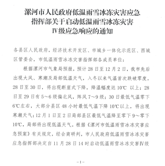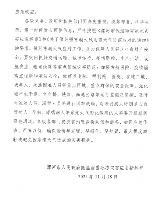 來(lái)源:漯河市人民政府低溫雨雪冰凍災(zāi)害應(yīng)急指揮部 時(shí)間:2022-11-28 14:10:00 點(diǎn)擊: 今日評(píng)論: