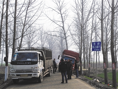 但是,記者看到,通過這座橋的,除了小客車,還有載重汽車。橋頭的限行樁上,也有許多擦痕。