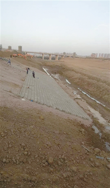 站在交通橋上望去,新河道工程進展順利,在河道下游左岸建設的一座排澇閘和上游西城區(qū)景觀取水口小涵閘主體都已經(jīng)完工。