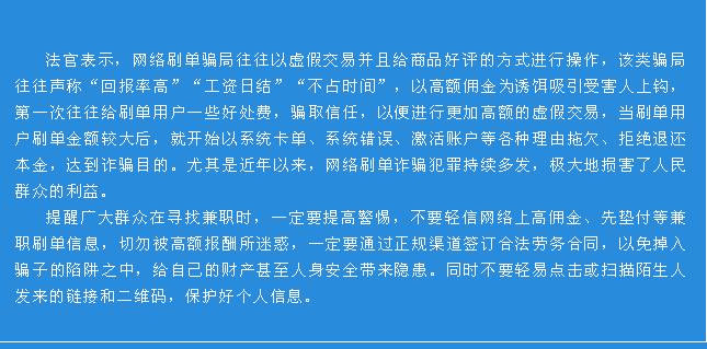 法官表示,網(wǎng)絡(luò)刷單騙局往往以虛假交易并且給商品好評的方式進(jìn)行操作,該類騙局往往聲稱“回報(bào)率高”“工資日結(jié)”“不占時(shí)間”,以高額傭金為誘餌吸引受害人上鉤,第一次往往給刷單用戶一些好處費(fèi),騙取信任,以便進(jìn)行更加高額的虛假交易,當(dāng)刷單用戶刷單金額較大后,就開始以系統(tǒng)卡單、系統(tǒng)錯(cuò)誤、激活賬戶等各種理由拖欠、拒絕退還本金,達(dá)到詐騙目的。尤其是近年以來,網(wǎng)絡(luò)刷單詐騙犯罪持續(xù)多發(fā),極大地?fù)p害了人民群眾的利益。