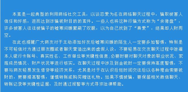 本案是一起典型的利用網(wǎng)絡(luò)社交工具,以談戀愛為名在網(wǎng)絡(luò)聊天過程中,騙取被害人信任和好感,進(jìn)而達(dá)到詐騙錢財(cái)目的的案件。一些人也將這種行騙方式稱為“殺豬盤”,許多被害人往往被騙子的噓寒問暖蒙蔽了雙眼,以為自己找到了“真愛”,結(jié)果卻人財(cái)兩空。