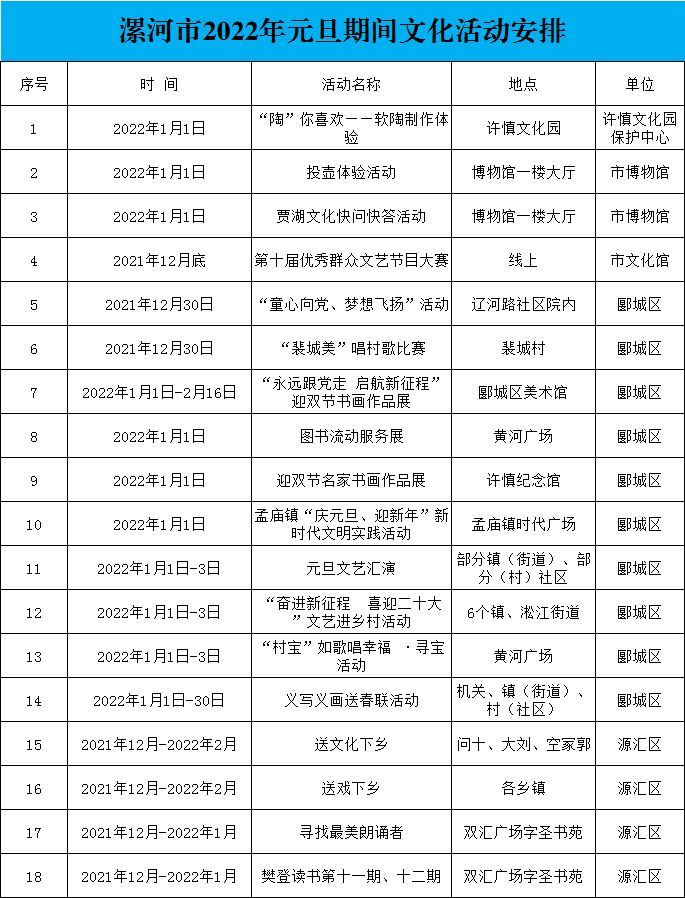 元有開始之意,“旦”指明天的意思,有辭舊迎新之意。元旦(New Year)便是一年開始的第一天,也被稱為“新歷年”“陽歷年”。為豐富和活躍節(jié)日期間人民群眾的精神文化生活,共享文化和旅游融合發(fā)展成果,營造歡樂的節(jié)日氛圍,突出漯河城市文化內(nèi)涵,漯河市文廣旅局組織開展多種民俗文化活動,致力于為全市人民營造祥和的元旦文化氛圍。