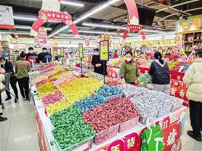 當(dāng)天下午,記者來到遼河路丹尼斯超市。超市內(nèi)紅色成了主色調(diào),洋溢著濃濃的喜慶氣氛。福字、中國結(jié)等傳統(tǒng)擺飾已經(jīng)上架,糖果、巧克力、餅干等年貨琳瑯滿目,水果、蔬菜、干貨、大米等商品也非常充足。