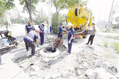 7月17日,郾城區(qū)住建局施工人員正在清理排污管道。
