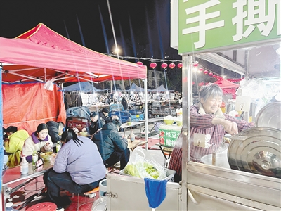 最吸引消費者的當(dāng)屬熱乎乎的麻辣面攤位。攤位旁邊的小桌子座無虛席,還有不少顧客選擇打包帶走。“這幾天溫度比較低,但是來吃手撕面的顧客仍然不少。一般傍晚六七點會迎來一波就餐高峰。有時候晚上11點還有人來這里吃上一碗面。我們通常營業(yè)到深夜12點。忙起來確實辛苦,但是和家人一起做生意的日子也很幸福。”經(jīng)營麻辣面攤位的黨阿姨告訴記者。