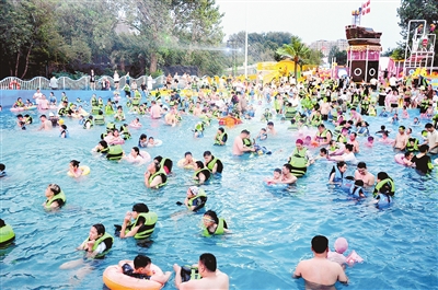 海盜船水寨前也是熱鬧非凡。家長牽著孩子的手穿過水簾,小沖天滑梯上的孩童像炮彈般滑入水池……專為兒童設(shè)計的戲水區(qū)里,水深二三十厘米,卡通造型的噴水玩具不斷噴出清水,孩子們玩得不亦樂乎。