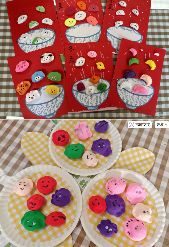 小班的寶貝們觀看生動(dòng)有趣的動(dòng)畫、共讀繪本故事,初次邂逅了“冬至”這個(gè)節(jié)日。他們用小巧手捏出五彩繽紛、造型各異的“黏土餃子”,將生活創(chuàng)意融入藝術(shù)創(chuàng)作。周末小寶貝們?cè)诩抑信c家人共品餃子美味,并用稚嫩的語言描述著“香香的”、“暖暖的”幸福滋味,完成了對(duì)冬至最溫暖的初體驗(yàn)。