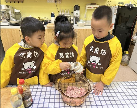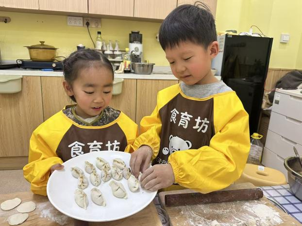 在食育坊里,孩子們穿上小圍裙,變身小小廚師。在老師手把手的指導(dǎo)下小心翼翼地剁著餃子餡,案板上的“噠噠”聲此起彼伏。和面時(shí),孩子們伸手揉、捏、壓,感受著面粉從松散到成團(tuán)的變化,臉上沾了面粉也笑得特別開心。