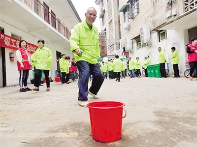 運(yùn)輸垃圾桶穿越障礙物是每名參賽選手先把成堆的垃圾掃進(jìn)垃圾桶,然后拖著垃圾桶繞著障礙物前進(jìn),比比誰的速度快。