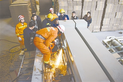 怎么辦?救援人員分為兩組,一組對機器進行拆卸,一組利用撬杠等工具撬動鋼卷軸。最終,被困女工被成功救出。