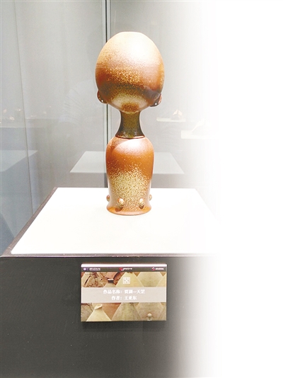 《賈湖——天罡》的創(chuàng)作者王亞東告訴記者,這件作品整體高99厘米、直徑36厘米,厚重中帶有靈氣,酷似9000年前抽象的“賈湖美女”。創(chuàng)作理念來源于舞陽賈湖遺址出土的乳丁陶器和雙耳陶器,采用傳統(tǒng)的手工拉胚制作工藝和柴燒落灰還原燒制工藝,材料選自沙河濕地黃膠泥和黑膠泥混合加沙燒制而成。