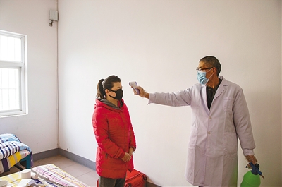 3月2日下午,在漯河市救助站二樓女區(qū),吃過午飯,余旺梅像往常一樣在房間內(nèi)休息,看手機(jī)上關(guān)于疫情進(jìn)展情況,然后測量體溫。余旺梅是一名月嫂,有時(shí)候,她還會看看書,或者練習(xí)一下按摩手法,為以后找工作做準(zhǔn)備。