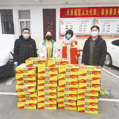 2月6日,志愿者楊英偉(左二)自費(fèi)購(gòu)買100箱方便面,分別送給召陵區(qū)東城街道辦事處、天橋街道辦事處和召陵區(qū)政協(xié)防疫值班點(diǎn)。記者 朱 紅 攝