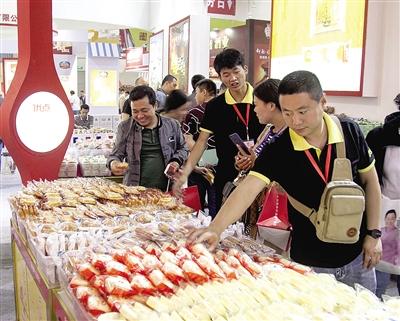 在場館內(nèi)的A區(qū)入口處,一個帶有濃濃中國風(fēng)的展位吸引了記者的目光。隨著一個個火紅的繡球望去,原來是“金老大老月餅”的展館。記者一進(jìn)入展館好像時光就拉回到中秋佳節(jié)。展館正中央,有一個直徑50厘米的大月餅,引來不少人圍觀。“這個月餅是我們這里最大的,可以根據(jù)顧客需要定制。想吃牛肉味的我們就做成牛肉味的,想吃五仁的就做成五仁的,只要顧客想得到,我們都可以做。”工作人員對記者介紹。