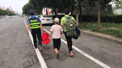 此時(shí),楊靜和馬晨光在轄區(qū)內(nèi)正巡查至燕山路(人民路-漓江路段),發(fā)現(xiàn)路邊一中年婦女背著大包小包領(lǐng)著一男童焦慮地左顧右盼,兩人立即上前了解情況。經(jīng)交談得知,這對(duì)母子因?yàn)閺臎]來過漯河,所以一下車就迷路了,又擔(dān)心又害怕,怕錯(cuò)過報(bào)名時(shí)間??吹綍r(shí)間緊迫,楊靜、馬晨光向母子簡單詢問了學(xué)校的名稱,因母子二人說不清楚學(xué)校具體地址,只好邊走邊問,最終安全將母子二人送達(dá)學(xué)校。同時(shí)將回去的乘車路線向小馬媽媽叮囑清楚。