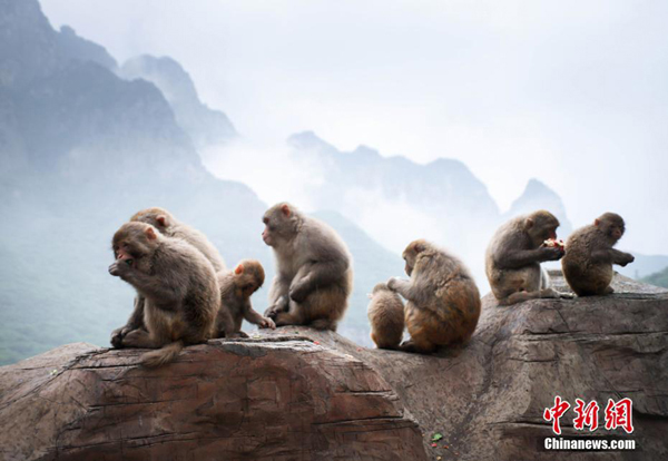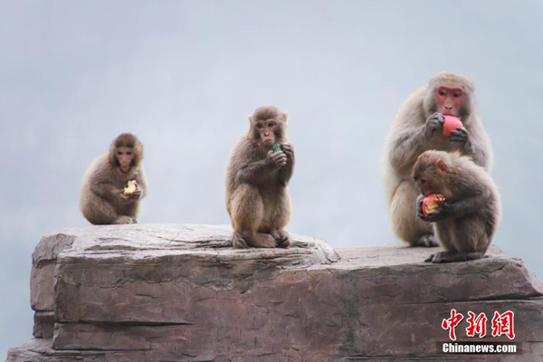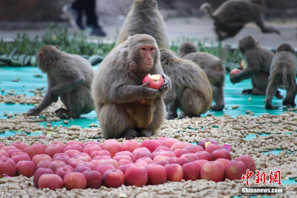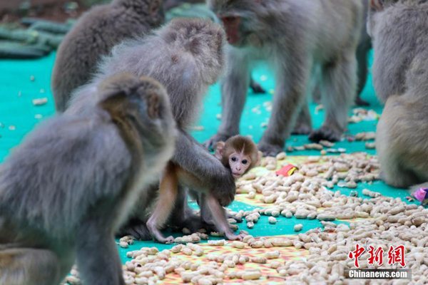 5月9日,在母親節(jié)到來之際,在位于河南濟源的太行山獼猴國家自然保護區(qū)——五龍口,工作人員為猴媽猴寶們添加營養(yǎng)餐,祝愿它們“母子平安”,現(xiàn)場用獼猴最愛吃的花生等拼成中國結圖案。圖為野生獼猴在進食。中新社記者 王中舉 攝