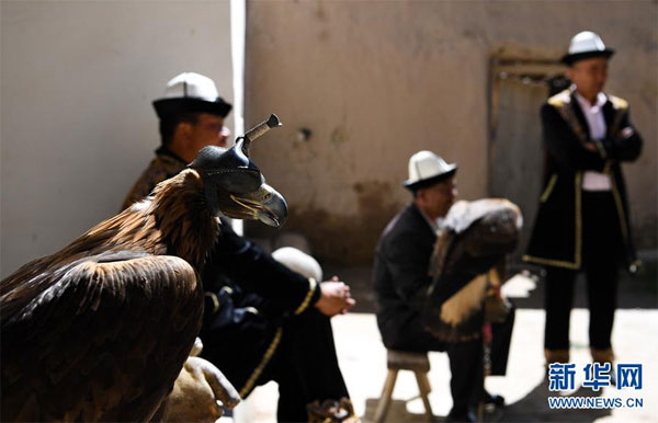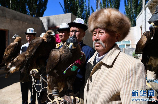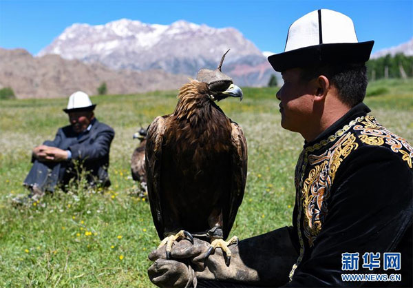 6月29日,庫爾馬西·胡特曼(右)和他的徒弟們展示獵鷹。 新華社記者 宋彥樺 攝