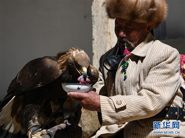 6月29日,庫爾馬西·胡特曼在家中給獵鷹喂食鮮羊肉。 新華社記者 宋彥樺 攝