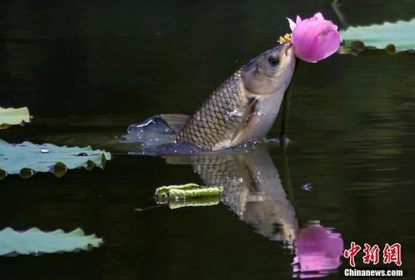7月3日,在成都工業(yè)學院一荷塘里上演“魚吃荷花”景觀,魚兒圍繞荷花游動,不時地躍出水面撕咬荷花,場面生動有趣。中新社記者 王磊 攝