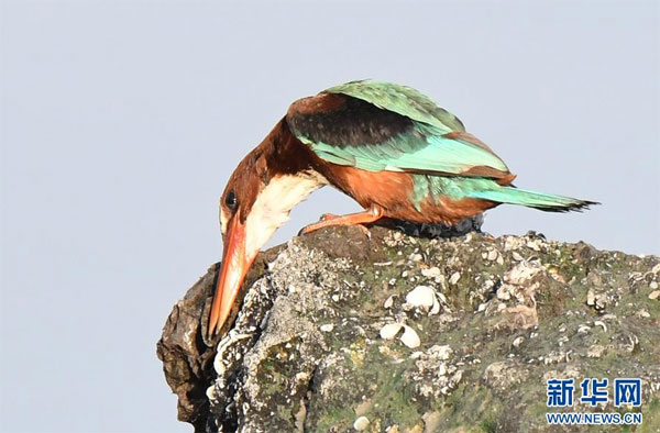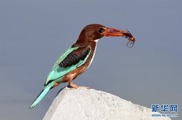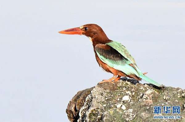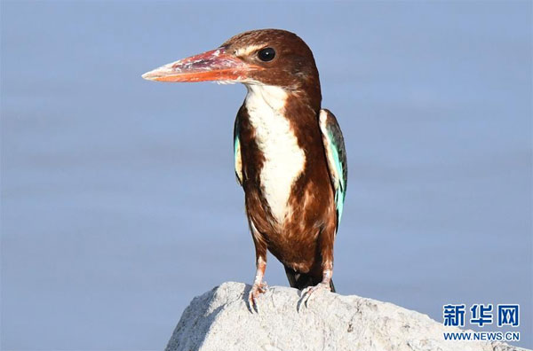 7月7日,在科威特首都科威特城海濱,一只白胸翡翠站在海邊巖石上。 新華社發(fā)(哈齊 攝)