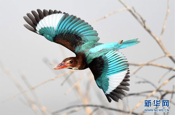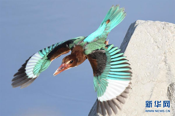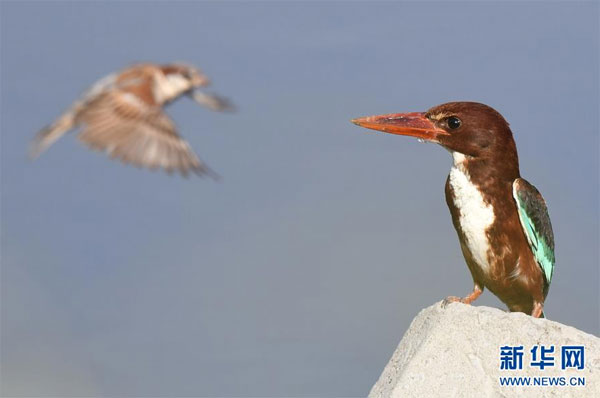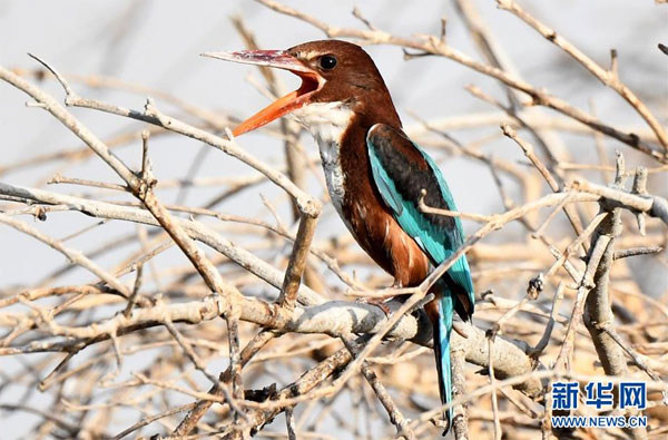 7月7日,在科威特首都科威特城海濱,一只白胸翡翠在鳴叫。 新華社發(fā)(哈齊 攝)