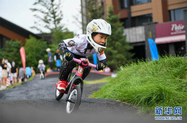 7月19日,小朋友在吉林市萬科松花湖度假區(qū)的山地車公園騎山地車。 夏日時節(jié),吉林省吉林市的萬科松花湖度假區(qū)利用滑雪場的地形優(yōu)勢,增添了高山花海、彩虹滑道等休閑旅游項目,吸引游客前來觀光游覽。 新華社發(fā)(顏麟蘊攝)