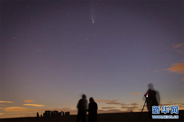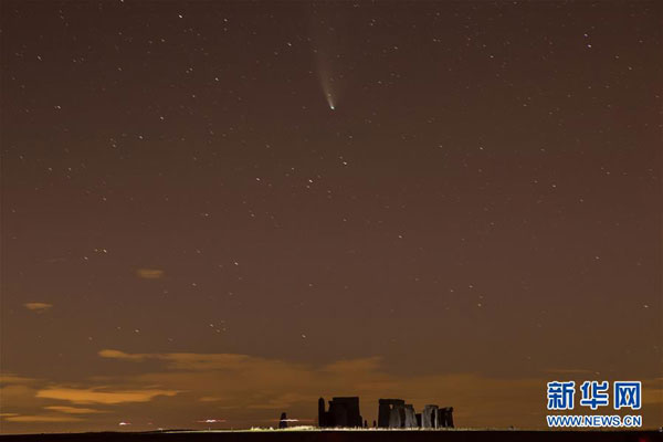7月22日,在英國英格蘭威爾特郡的巨石陣,新智彗星劃過天際。 新智彗星是一顆長周期彗星。根據(jù)此前的觀測計(jì)算,其公轉(zhuǎn)周期為4400年。但它經(jīng)過近日點(diǎn)后,受太陽引力和大行星引力影響軌道發(fā)生改變,公轉(zhuǎn)周期變?yōu)?800年。 新華社發(fā)(蒂姆·愛爾蘭攝)