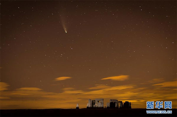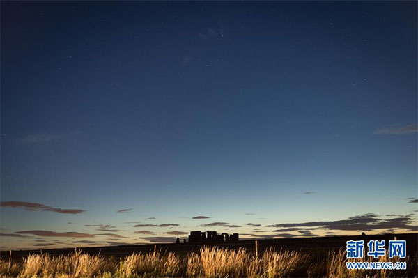 7月23日,在英國英格蘭威爾特郡的巨石陣,新智彗星劃過天際。 新智彗星是一顆長周期彗星。根據(jù)此前的觀測計(jì)算,其公轉(zhuǎn)周期為4400年。但它經(jīng)過近日點(diǎn)后,受太陽引力和大行星引力影響軌道發(fā)生改變,公轉(zhuǎn)周期變?yōu)?800年。 新華社發(fā)(蒂姆·愛爾蘭攝)