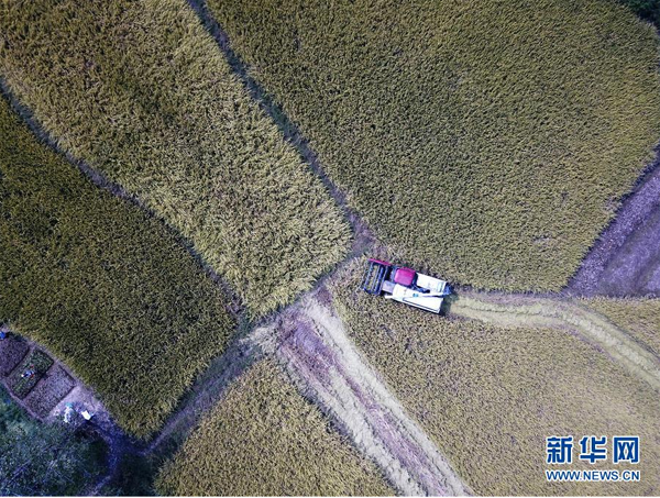 9月26日,花崗鎮(zhèn)河豐社區(qū)農(nóng)民駕駛收割機(jī)收割水稻(無人機(jī)照片)。 近日,安徽省肥西縣花崗鎮(zhèn)河豐社區(qū)水稻陸續(xù)成熟,當(dāng)?shù)剞r(nóng)民搶抓晴好天氣收割水稻,力爭(zhēng)讓稻谷顆粒歸倉。 新華社記者劉軍喜攝