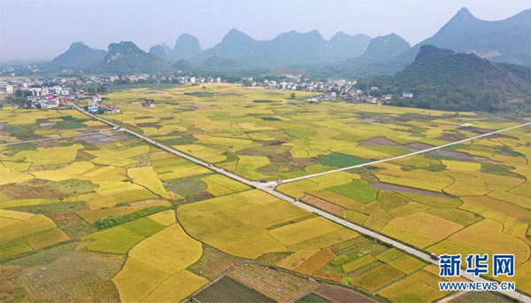 11月1日拍攝的廣西柳州市柳江區(qū)進(jìn)德鎮(zhèn)泗浪村的稻田(無(wú)人機(jī)照片)。新華社發(fā)(黎寒池 攝)
