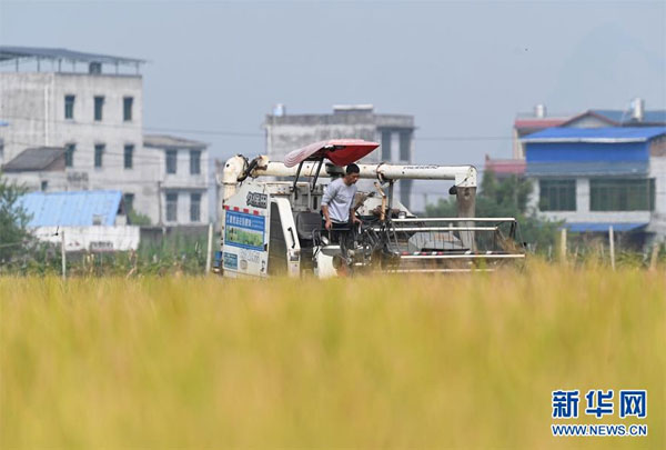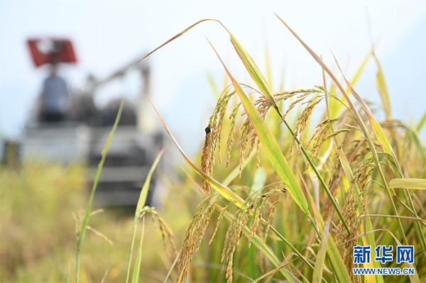 11月1日,在廣西柳州市柳江區(qū)進(jìn)德鎮(zhèn)泗浪村,農(nóng)民駕駛收割機(jī)在稻田里收割晚稻。新華社發(fā)(黎寒池 攝)