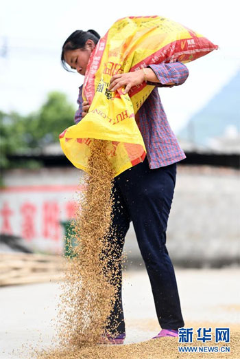 11月1日,在廣西柳州市柳江區(qū)進(jìn)德鎮(zhèn)泗浪村,農(nóng)民韋鳳育晾曬剛收割的稻谷。新華社發(fā)(黎寒池 攝)