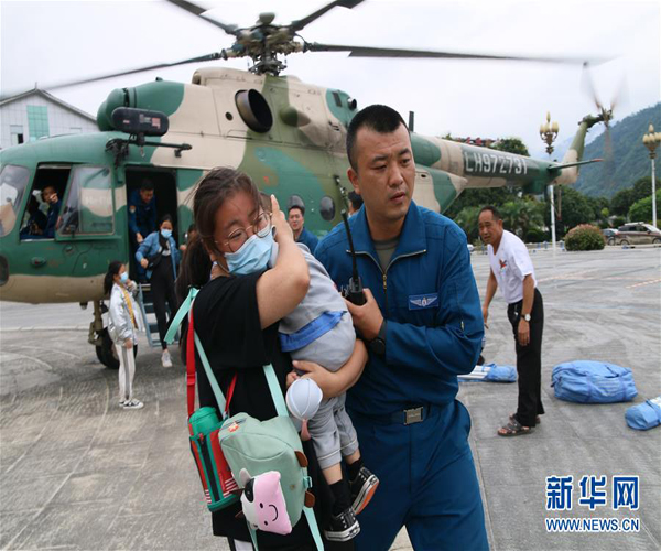 連續(xù)強降雨導致四川省綿陽市平武縣山體滑坡,西部戰(zhàn)區(qū)陸軍第77集團軍某陸航旅飛行員張尚年奉命轉運災區(qū)群眾(8月22日攝)。新華社發(fā)
