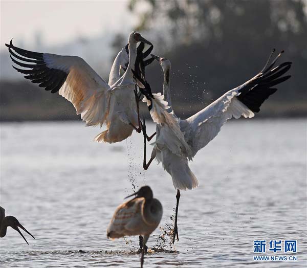 12月21日,白鶴在南昌五星白鶴保護(hù)小區(qū)的濕地中嬉戲。